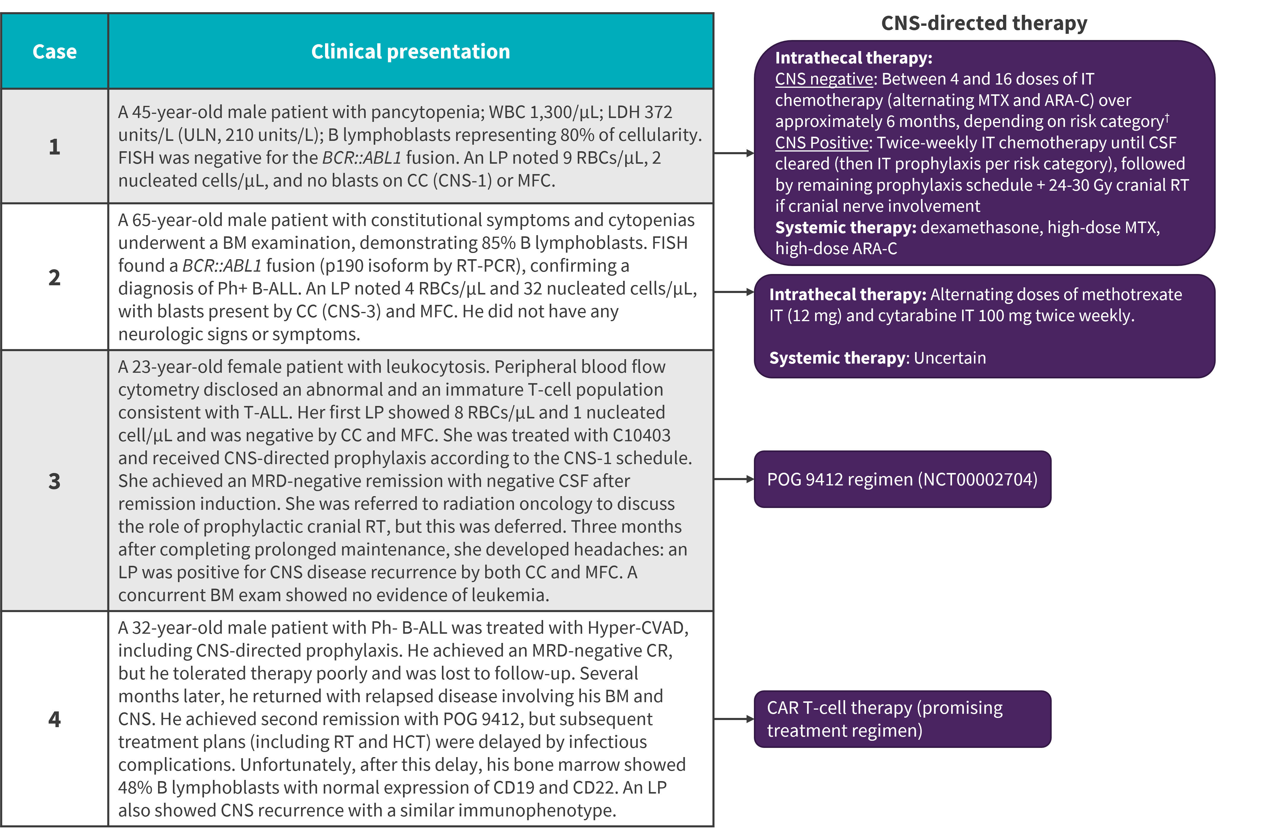 Ara-C, cytosine arabinoside; ALL, acute lymphoblastic leukemia; BM, bone marrow; CAR T-cell, chimeric antigen receptor; CC, conventional cytospin; CNS, central nervous system; CR, complete response; CSF, cerebrospinal fluid;; FISH, fluorescence in situ hybridization; HCT, hematopoietic stem cell transplant; Hyper-CVAD, hyper fractionated cyclophosphamide, vincristine, doxorubicin, and dexamethasone alternating with high-dose methotrexate and cytarabine; IT, intrathecal; LDH, lactate dehydrogenase; LP, lumbar puncture; MFC, multi-channel flow cytometry; MRD, minimal residual disease; MTX, methotrexate; PCR, polymerase chain reaction; Ph+, Philadelphia-chromosome positive; RBC, red blood cell; RT, radiotherapy; ULN, upper limit of normal; WBC, white blood cell.