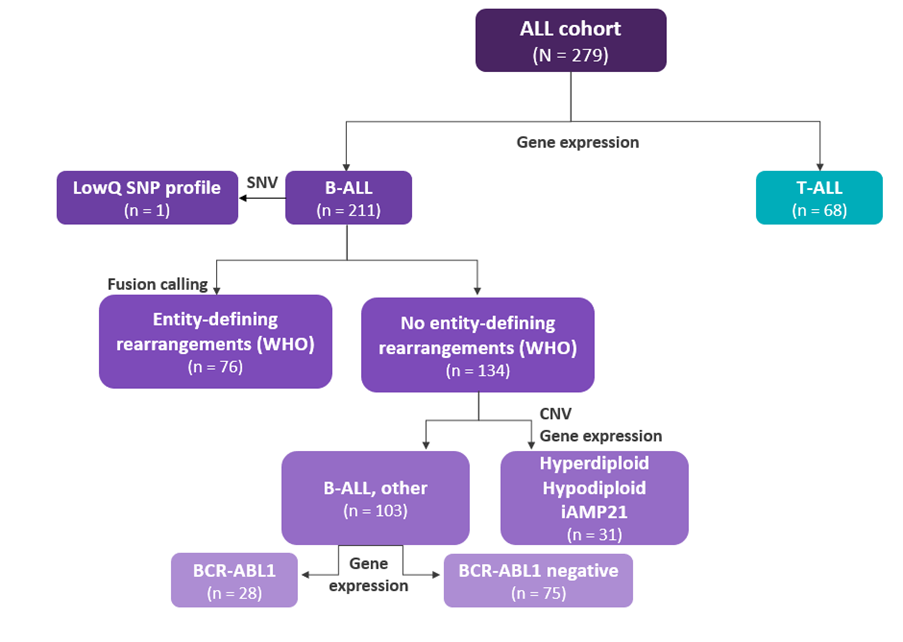 ALL, acute lymphoblastic leukemia; B-ALL, B-cell ALL; CNV, copy number variation; iAMP21, intrachromosomal amplification of chromosome 21; LowQ, low quality; SNP, single nucleotide polymorphism; SNV, structural nucleotide variant; T-ALL, T-cell ALL; WHO, World Health Organization.